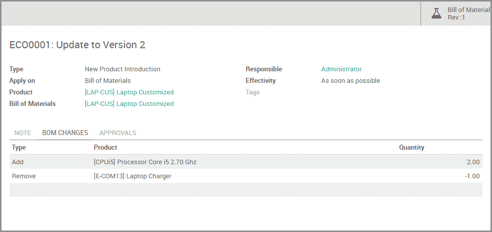 PLM extended the Manufacturing capabilities of Odoo by supporting Engineering Change Orders to revise Bills of Materials and/or Routings for products. Odoo 10 keeps track of what you add and remove at each revision and makes it easier to attach Engineering drawings and documents.
