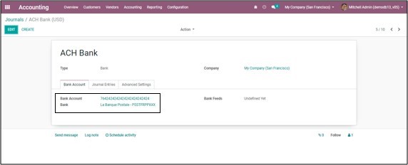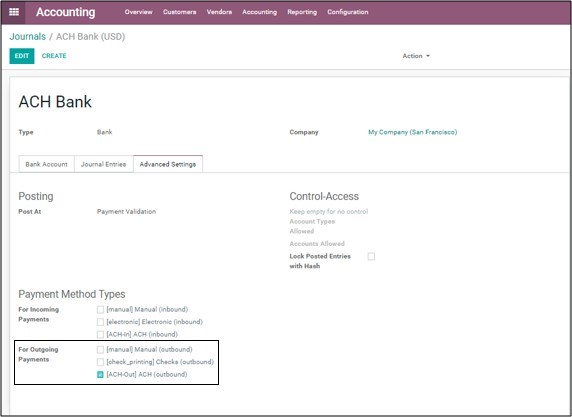 - You need to have a Journal especially for the ACH process (For eg: As shown below, this is a bank journal created for Odoo ACH process)
