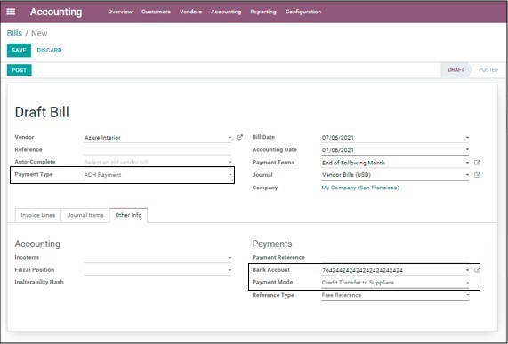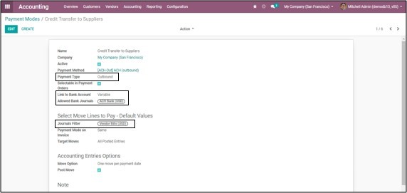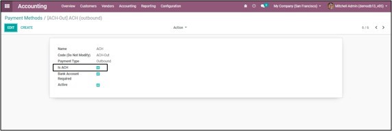 - The below image shows the Payment method for Odoo ACH Process wherein the payment type is as outbound for Vendor bills
