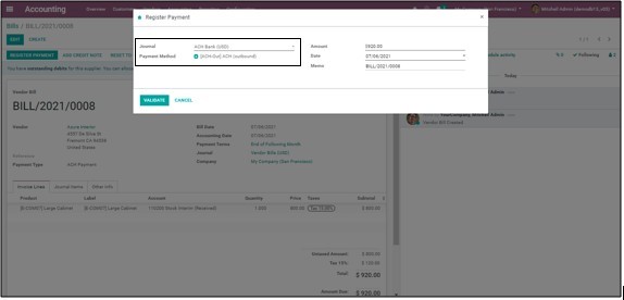 - While registering the payment, there is auto selection of ACH journal and Payment method for ACH