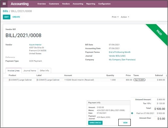 - On selecting the vendor, the payment type, bank account and payment mode for that vendor gets selected. Though you can make changes in the above fields in the form view as per your requirements