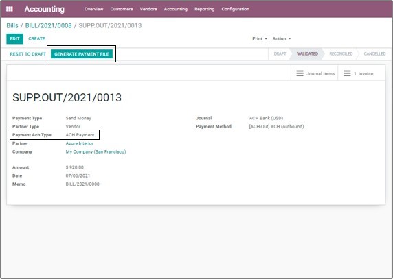 - In above fig the payment ACH type will be auto selected. a new button ‘Generate Payment File’ is added where it can generate a NACHA file for the vendor bill