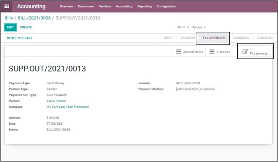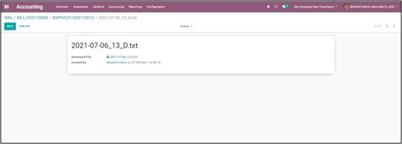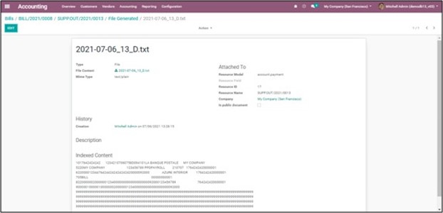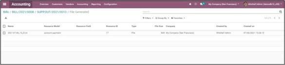 - Once the file is generated, the payment status moves to ‘File Generated’, also a smart button is added where we can view the files that are generated.
