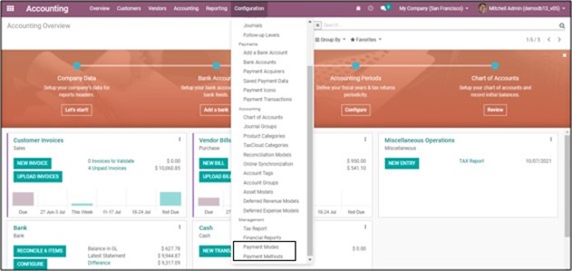 - In the Accounting menu under Configuration, two new menu items are added which are ‘ Payment Modes’ and ‘Payment Methods’.