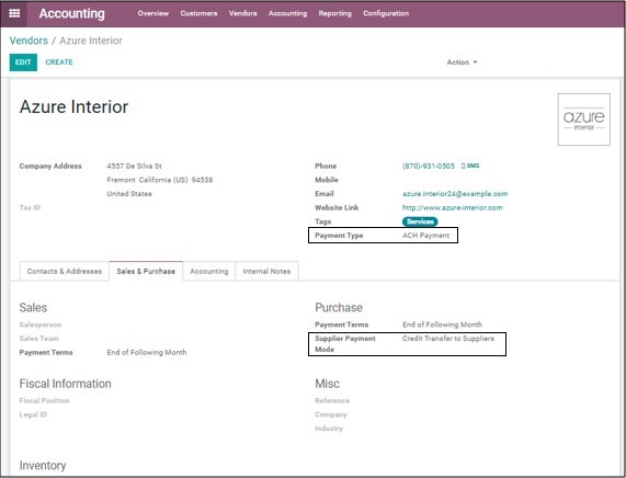 - Once you select the payment type as ACH in Odoo ACH module, you need to select the supplier payment mode in the Sales & Purchase page. (For eg: Here it selects the demo payment mode)
