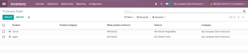 Example: In a retail store storing vegetables and fruits, we have to store vegetables in vegetable locations and fruits in fruit locations, and they are in the same warehouse stock. That’s where putaway rules intervene to avoid storing products wrongly.