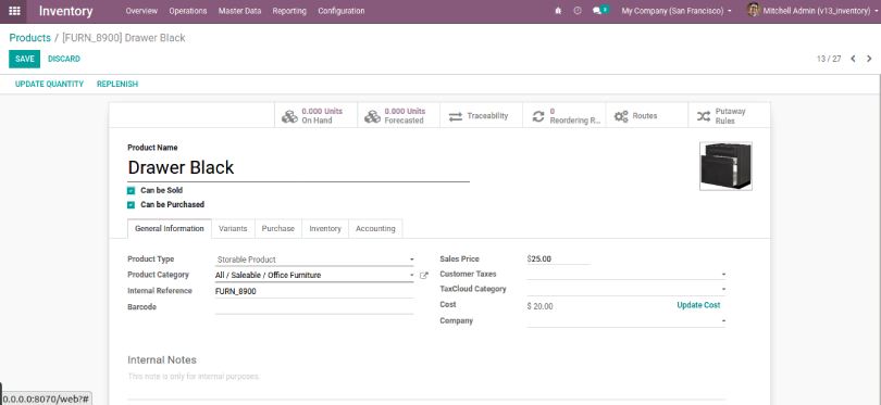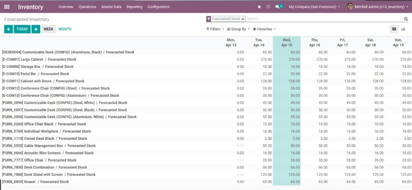 - Forecasted Inventory: Odoo inventory Forecast is the way towards ascertaining the stock expected to satisfy future client orders dependent on how much product you anticipate to sell over a particular time frame. With Odoo 13, inventory forecasting is all easier. One can quickly retrieve the forecasted inventory with the help of new graph and grid views.