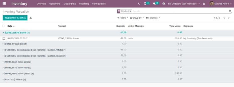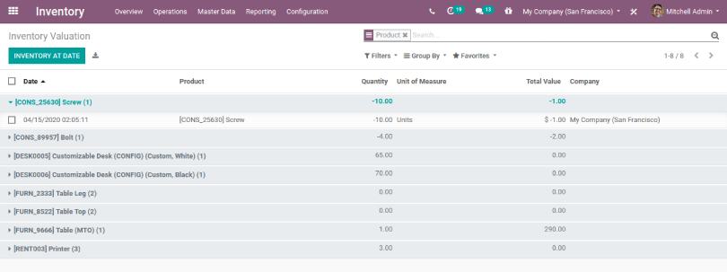 Inventory Valuation: Odoo’s inventory Valuation Report shows the value of the available product. The value is calculated based on the Cost Price, which is configured on the product