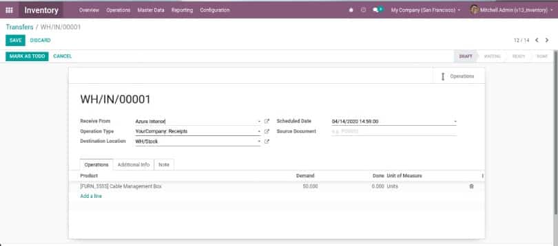 In the operation, you need to add the details of the product name and quantity in ‘Demand’ for receiving the products.