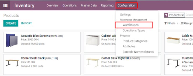 Path: Inventory → Configuration → Warehouse Management → Warehouses.