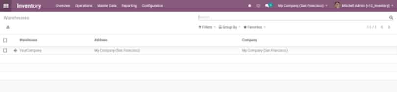 When you click on the menu you will see a list of Warehouse. Here we have only one warehouse. You can add any warehouse to Odoo inventory.