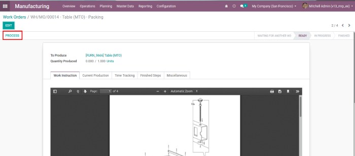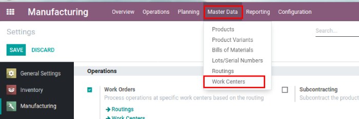 2) Creating a Manufacturing order by customizing the work order, and setting up the Work Center & Routing.