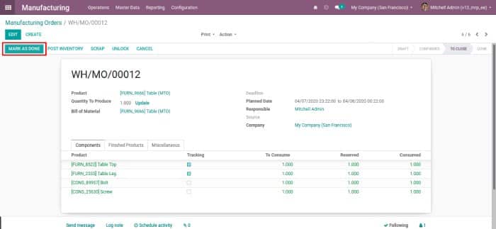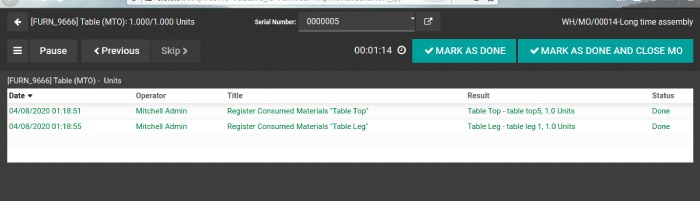 When the entire production is finished we shall click “Mark as done” or “ Mark as done and close MO”. Then the production is completed.