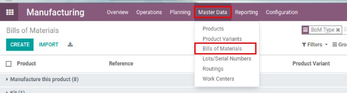 Path: Manufacturing → Master Data → Bill Of Material → Create.