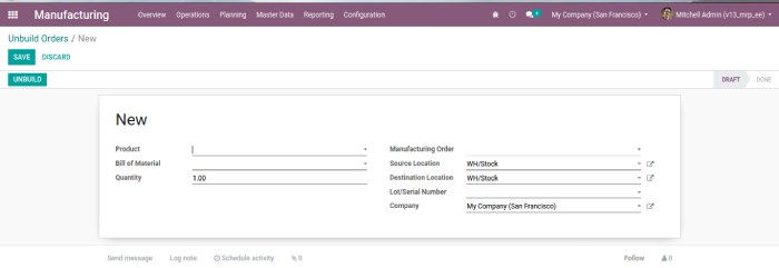 Unbuild is yet another innovative feature in Odoo 13 manufacturing ERP. Here we can unbuild a manufactured product in case of damage caused to any of its parts so that we need not scrap the full product. We can unbuild the product and take the good parts from it.