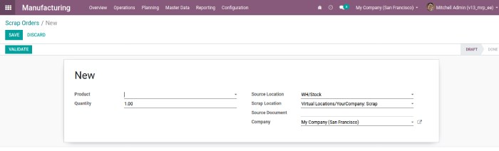 Path: Manufacturing → Operations → Scrap Orders → Create