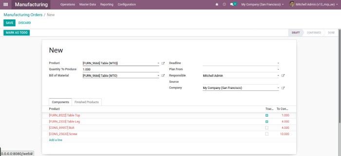 Product: Select a product to manufacture in the Odoo manufacturing ERP module.