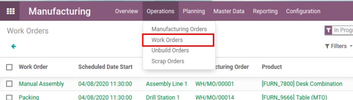 Path: Manufacturing → Overview → Click on the Work Orders button.