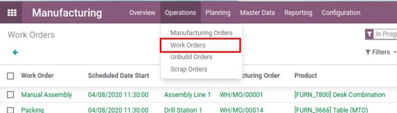 2) Clicking on any of the work orders by following this Manufacturing → Operation → Work Orders.