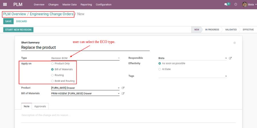 You can select ECO type and apply based on that column. Once the record is generated click on the “Start New Revision” button for further process.
