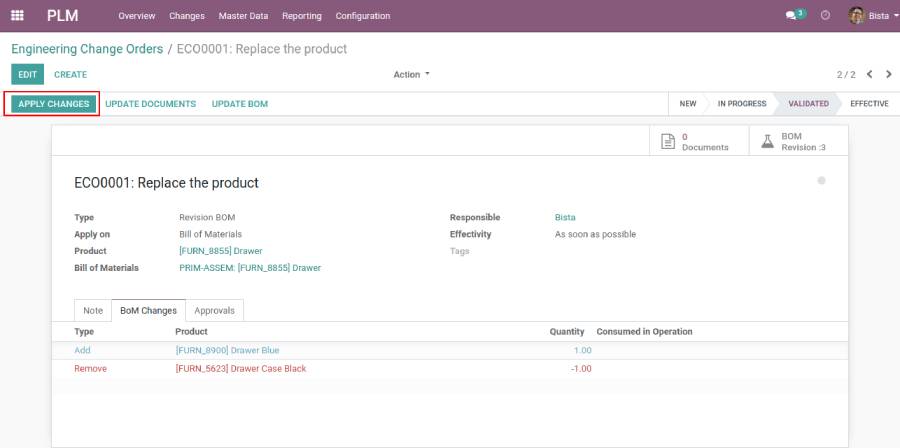 Validate: As per configured the stages this will be the final stage to apply changes based on ECO apply on selection.