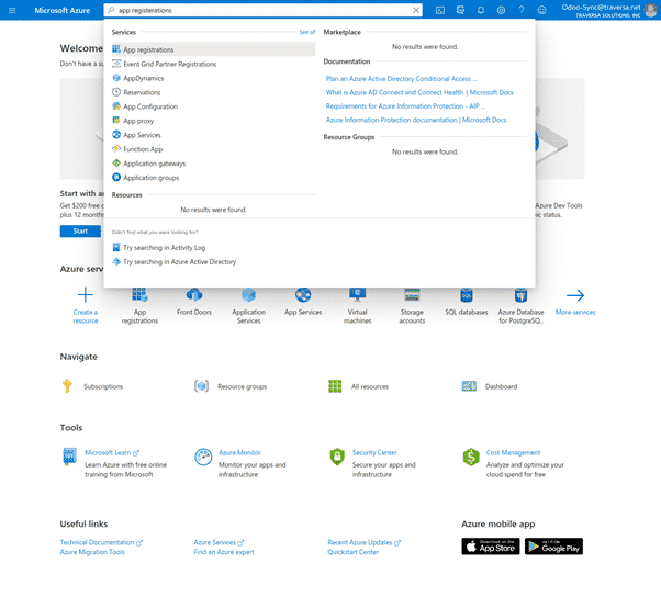 2) You will be asked to log in for the Microsoft Account. After Logging in the following screen will appear where you need to search for App registration.