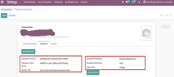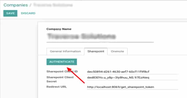 - Now since the Configuration is done we need to Authenticate/Valid the credentials and establish the connection between odoo and SharePoint via Odoo SharePoint integration
