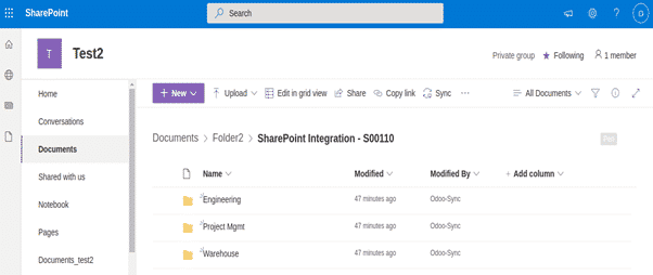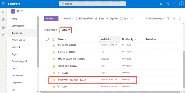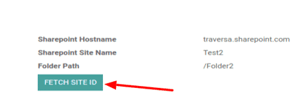 - Now since we need to sync the data from odoo to SharePoint, we need to specify the site name so that the date we add or make any change will be updated on that particular site. Here its Test2