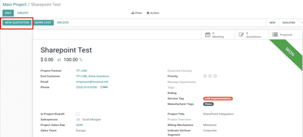 - So here a lead was marked as won, having the Project name Odoo SharePoint Integration.
