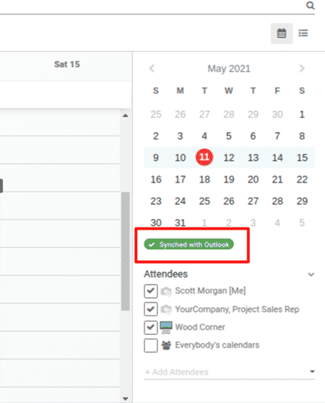 - Now go to the Calendar module in odoo. You can see there is a green baar in the right side which says, ‘Synced with Outlook’.