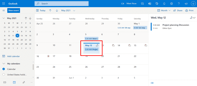 - You can visit Office.com and go to the calendar section where the record that was created in odoo on the specified date with its purpose, has been updated over here.