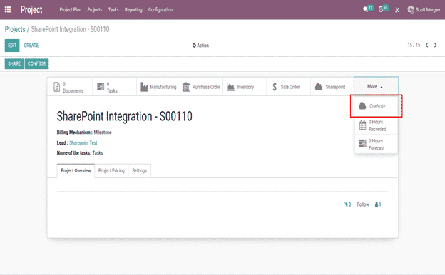 There is flow from configuring the OneNote and SharePoint in odoo to planning the project that redirects to both of the above portals.