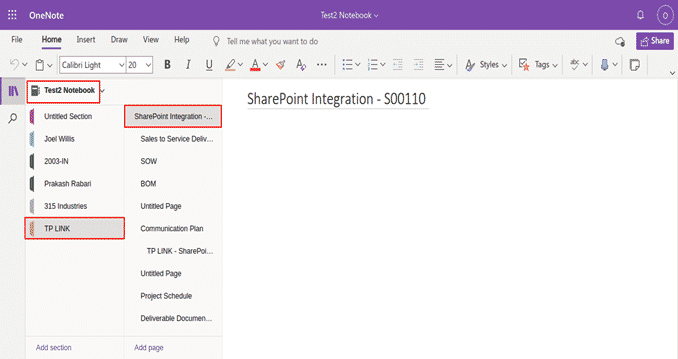 - You can now see the OneNote Portal has been opened and you can see the Test2 Notebook has been opened with the customer name as the heading name.