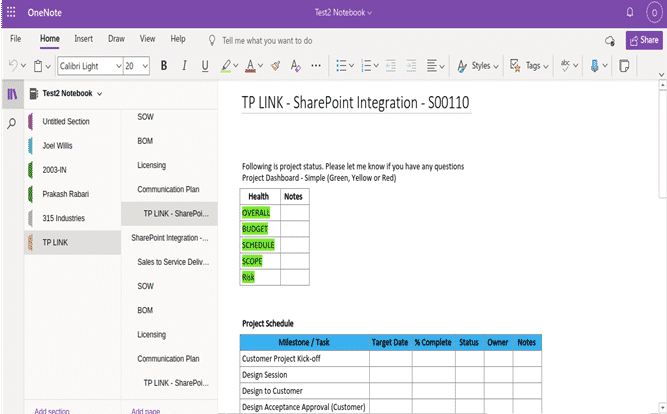 - Once the Project is planned, you can click on the button which will redirect to the OneNote portal where you can see the pages are created with Heading as the Customer name, and a hierarchy is followed which will be further demonstrated.