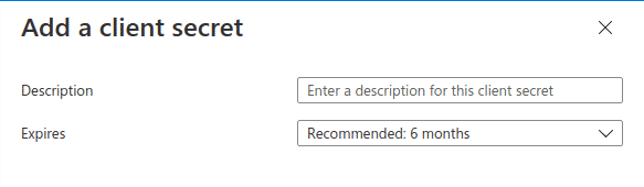 - Once clicked, on the above button, there will be an option for a New client secret. When you click on it, a window will appear where you need to write a description of the client e.g name, organization name, etc., and the time for the expiration of the key of that client.